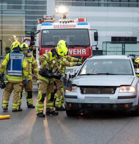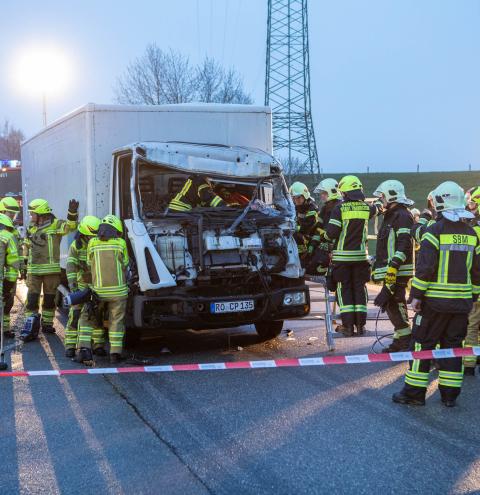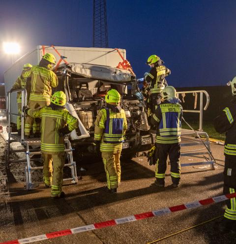 Bei dem Auffahrunfall zwischen einem PKW und einem LKW waren Einsatzkräfte aus Siegsdorf und Traunstein gefordert. Durch den Einsatz schweren technischen Geräts konnten so vier weitere eingeklemmte Personen aus den Fahrzeugen gerettet werden. In diesem Einsatzabschnitt stellte die hohe Sitzposition des LKW-Fahrers eine besondere Herausforderung dar. Daher kam dort unter anderem eine sogenannte Rettungsplattform zum Einsatz, um den Höhenunterschied zwischen Straße und Fahrerkabine zu überwinden.