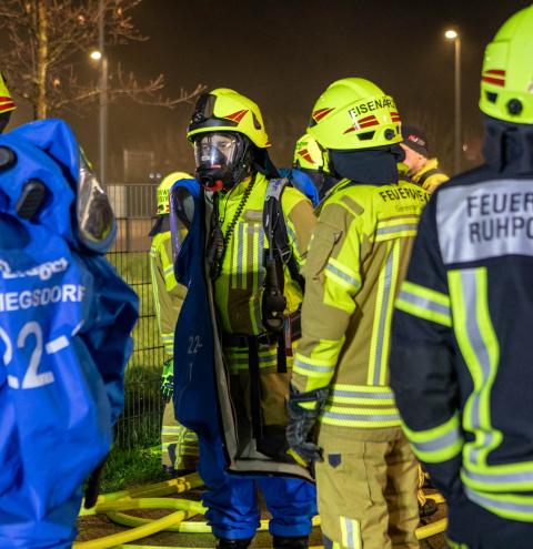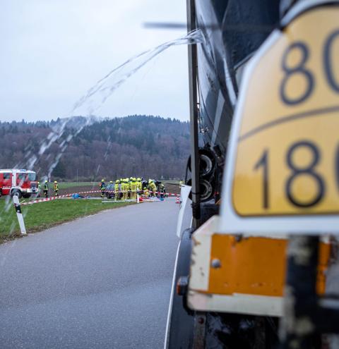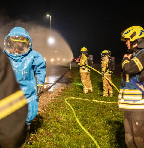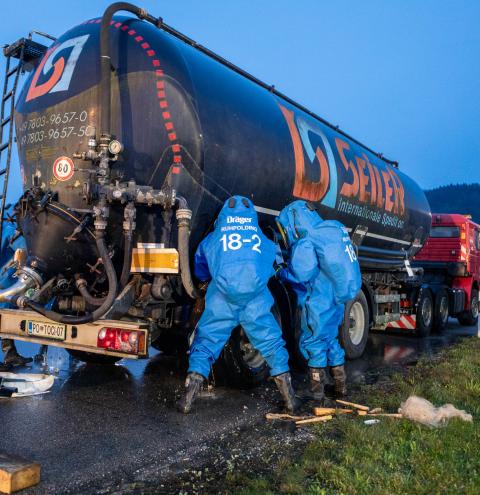 Neben den Erstmaßnahmen zum Auffangen der austretenden Flüssigkeit wurden umfangreiche Maßnahmen zur Eindämmung des Gefahrstoffaustritts erforderlich. Besonderes Augenmerk lag auf der Arbeit unter schweren Chemikalienschutzanzügen, dem Abdichten des austretenden Stoffes sowie dem Aufbau und Betrieb einer Dekontaminationsstelle. „Gefahrguteinsätze sind für die Feuerwehren häufig sehr komplexe Einsatzlagen, die neben umfangreichem taktischem Wissen auch eine material- und personalintensive Herangehensweise erfordern“, erklärt Rupert Kink.