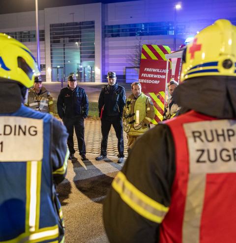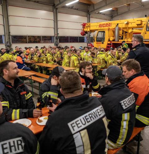 Im Nachgang der Übung kamen die Teilnehmer in den Hallen der Firma Rigra zu einer kurzen Nachbesprechung zusammen. Auf Einladung der Gemeinde Siegsdorf konnten sie den Abend mit einer gemeinsamen Brotzeit ausklingen lassen, ehe sie ihre Heimreise antraten. Insgesamt waren 180 Feuerwehrleute aus den Feuerwehren Siegsdorf, Eisenärzt, Hammer, Vogling, Ruhpolding, Vachendorf, Übersee und Traunstein in die Übung eingebunden. Hob