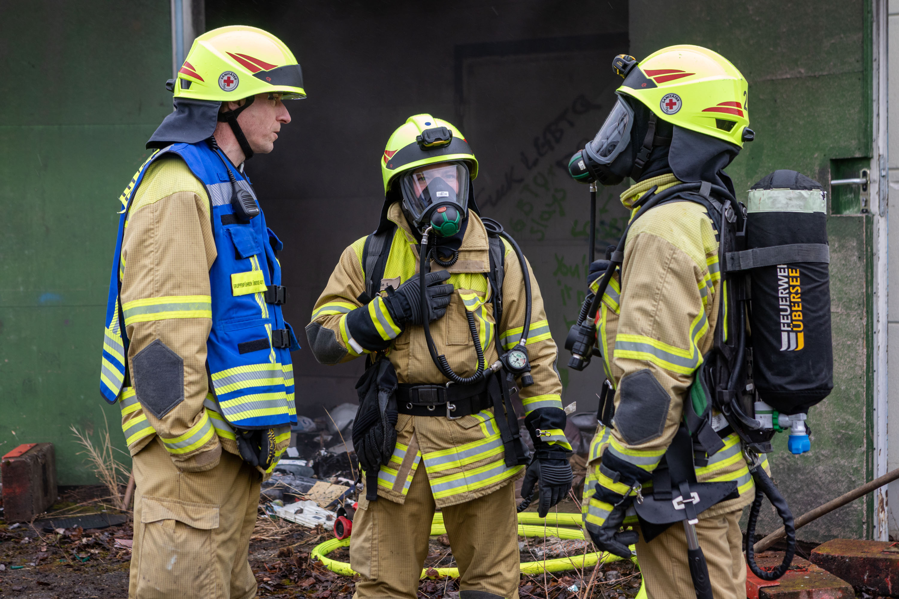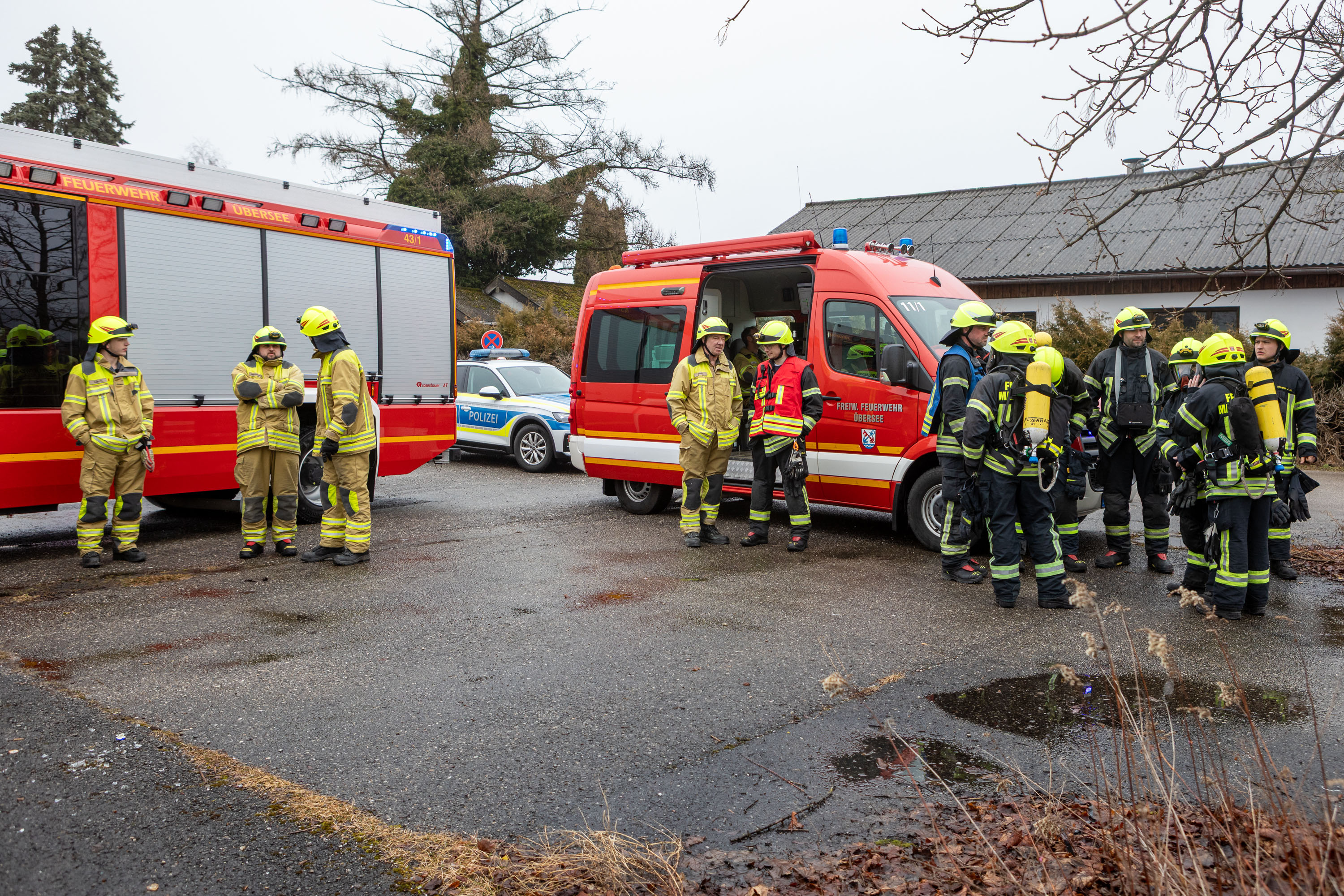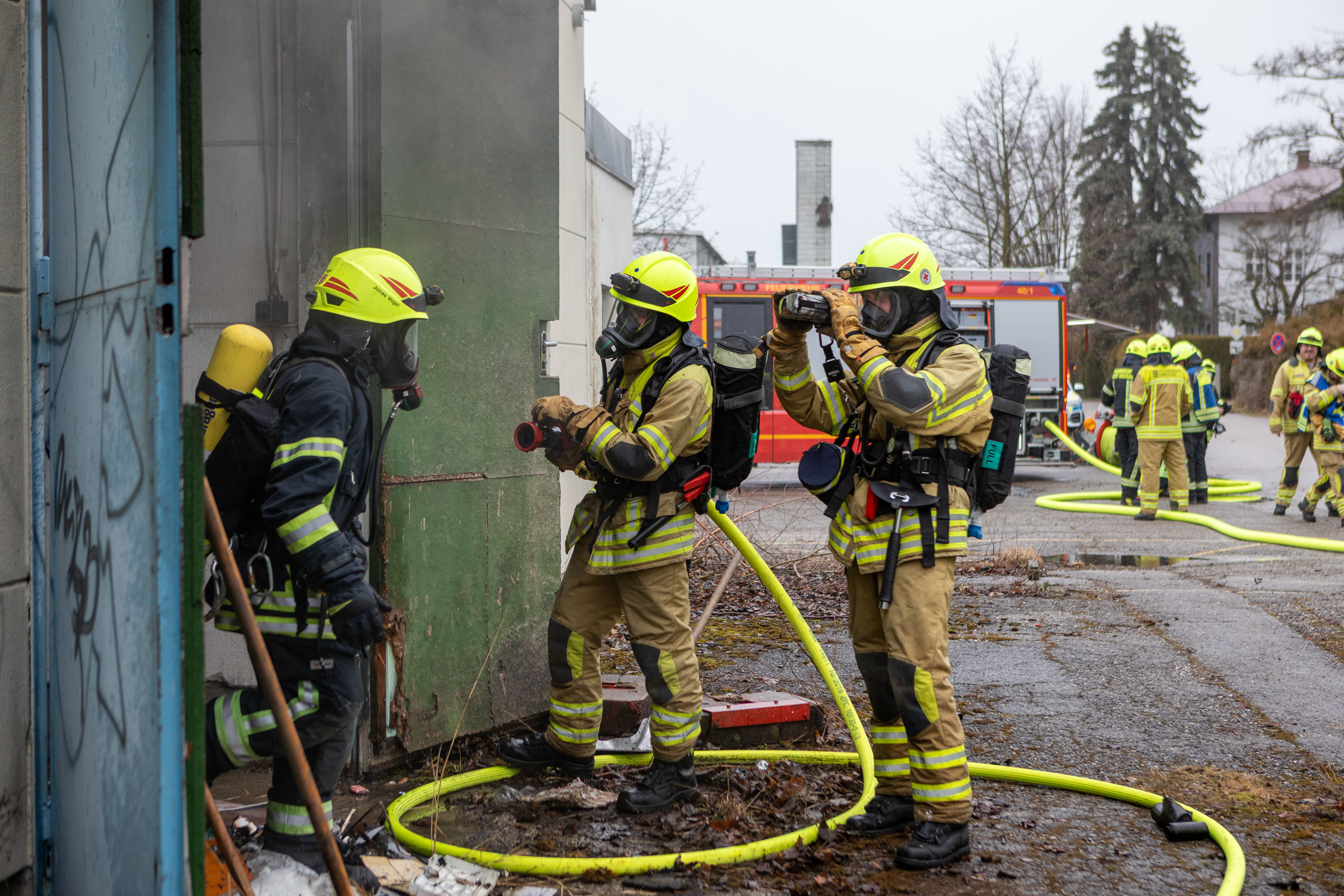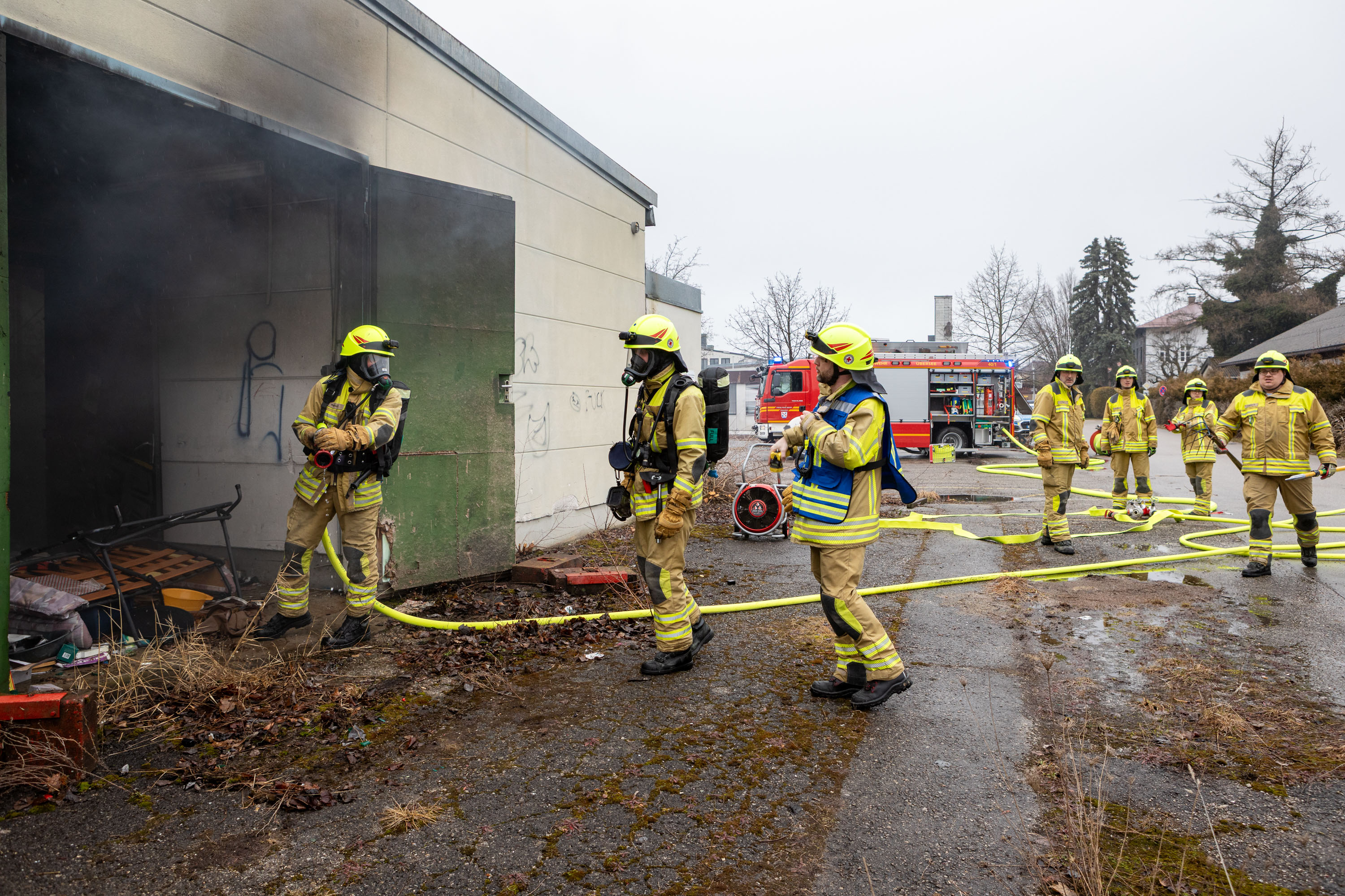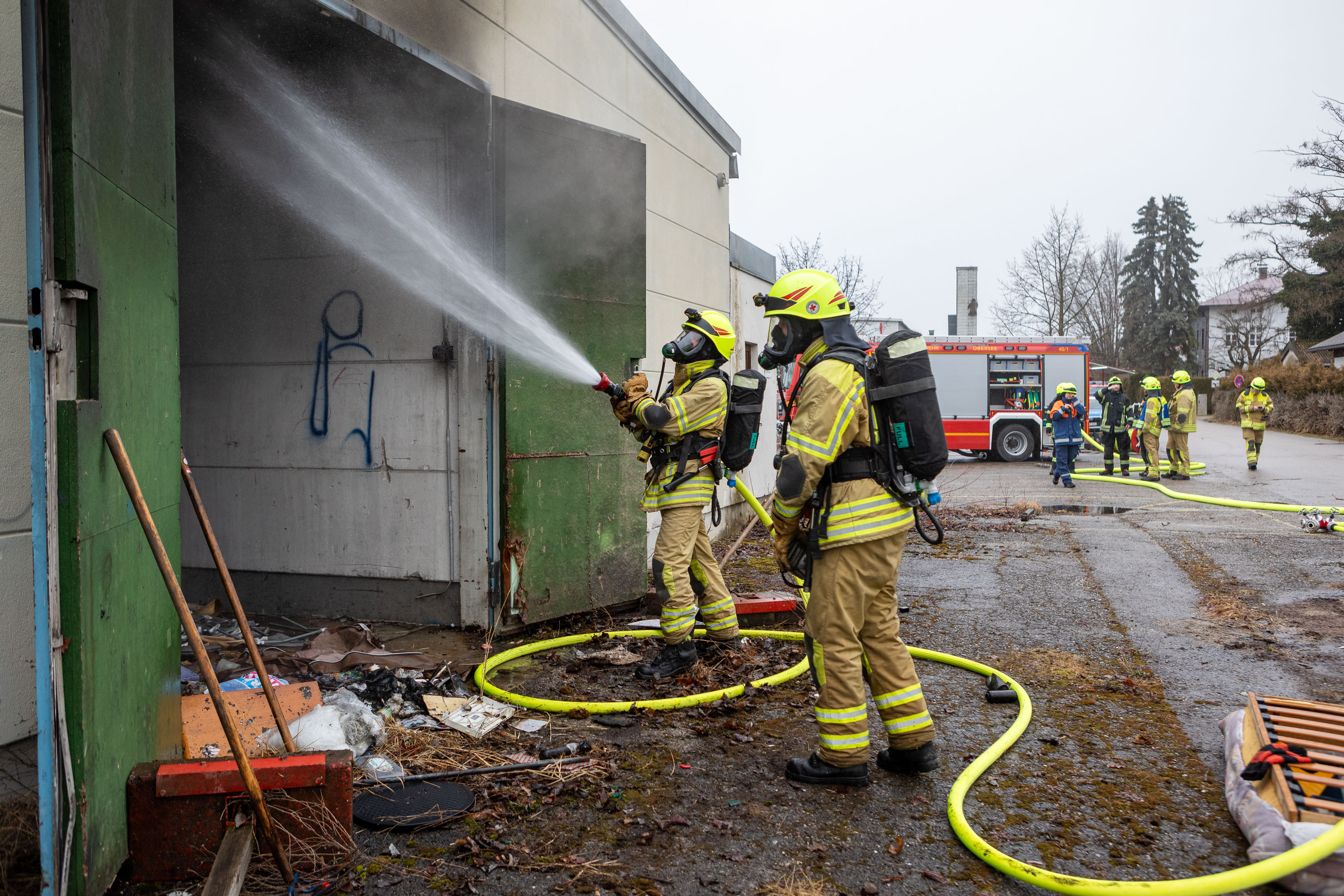 Die ersten Einsatzkräfte trafen innerhalb kurzer Zeit ein und verschafften sich rasch einen Überblick über die Lage. „Bei unserem Eintreffen drang tatsächlich eine Rauchsäule aus der Halle; im Inneren war ein brennender Unrathaufen zu erkennen“, informiert Lucas Geppert, stellvertretender Kommandant und Einsatzleiter der Feuerwehr Übersee.
