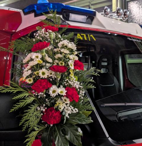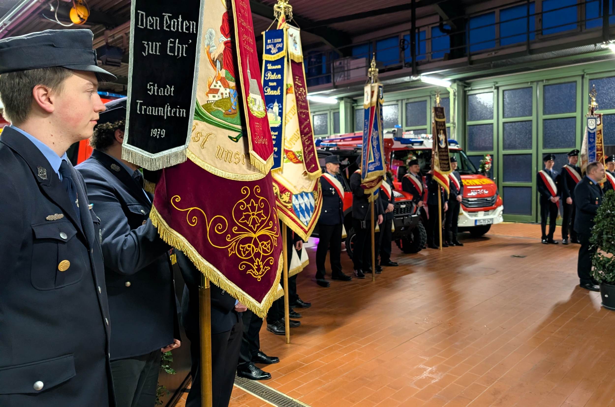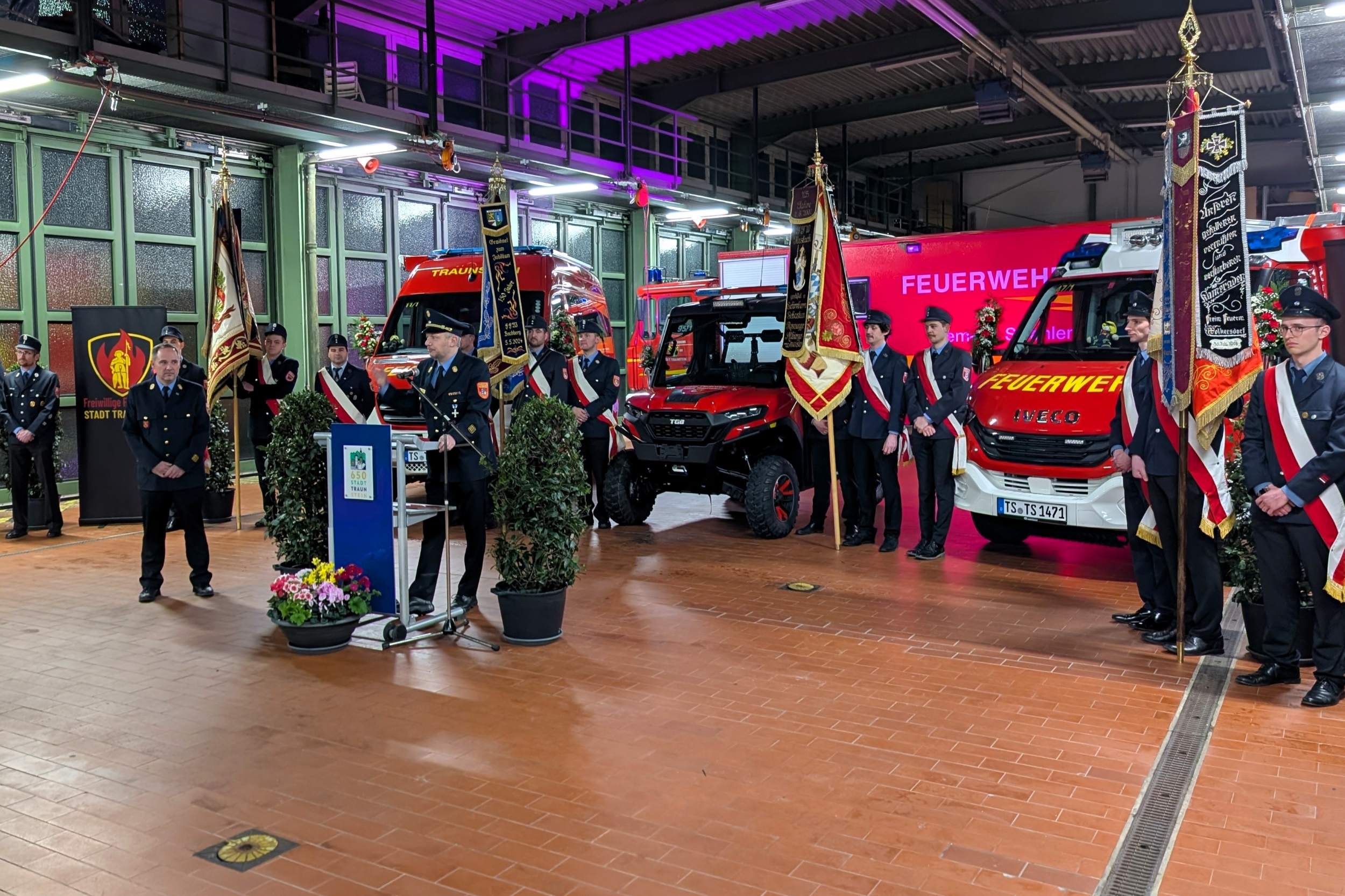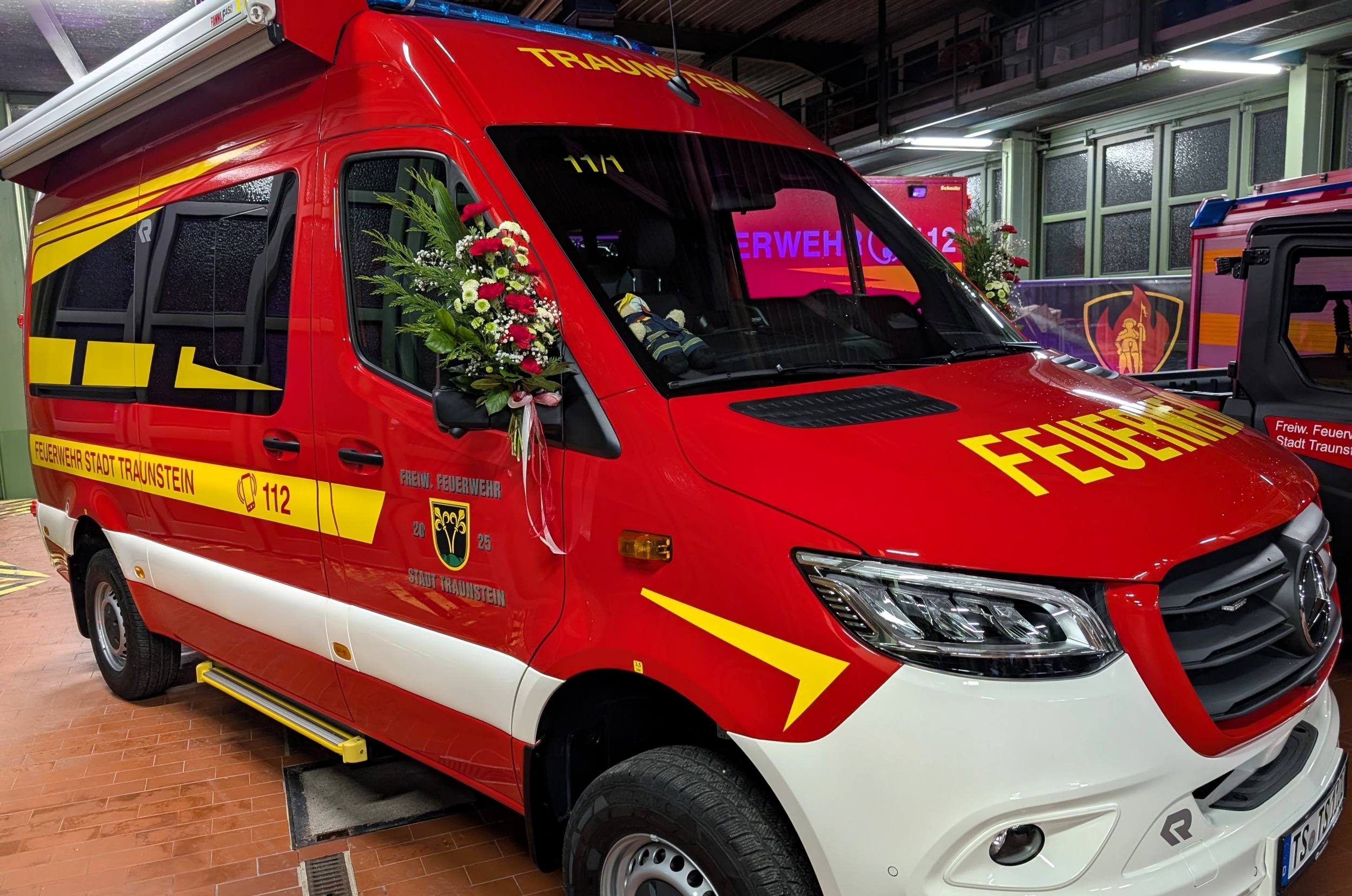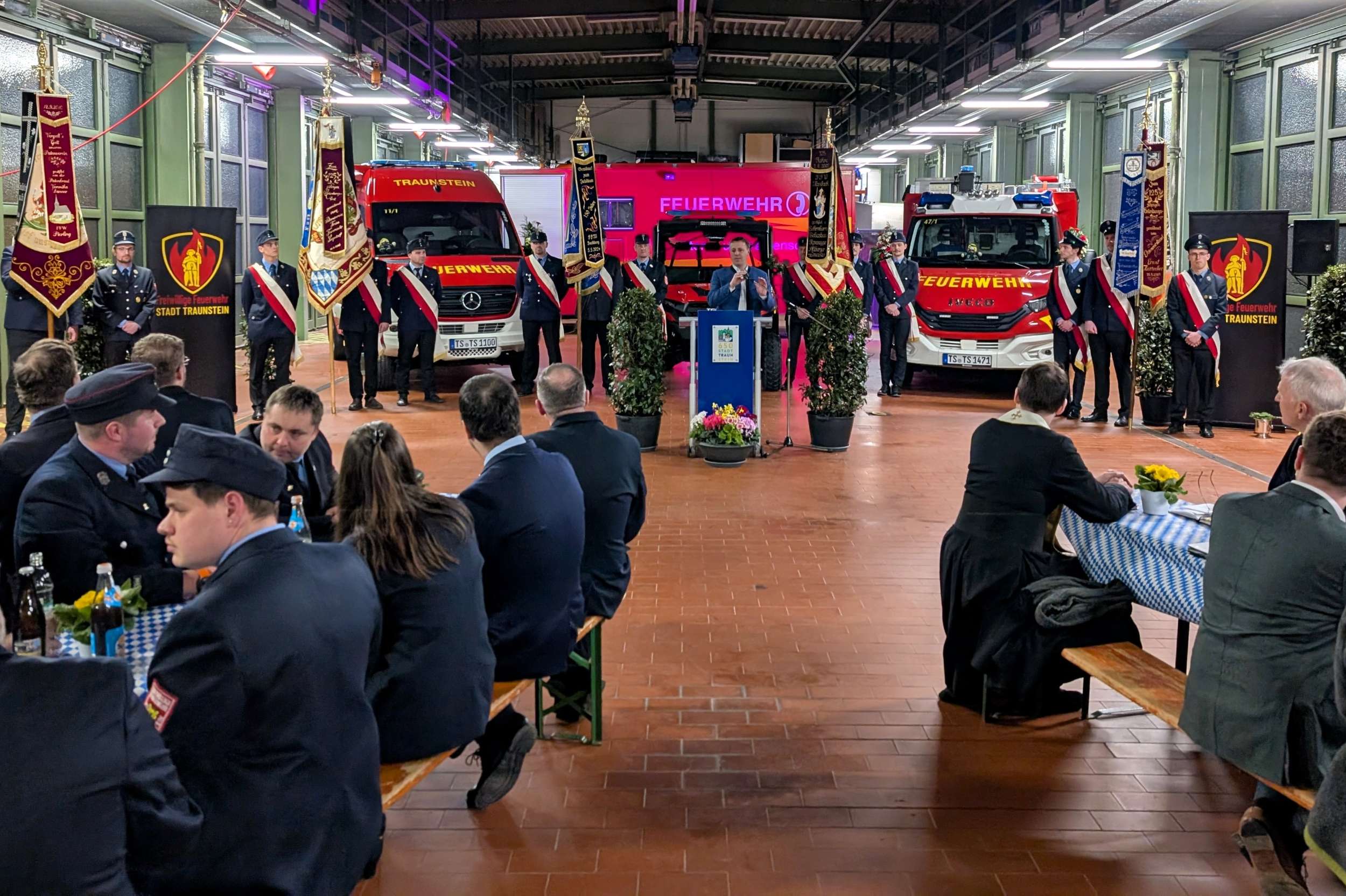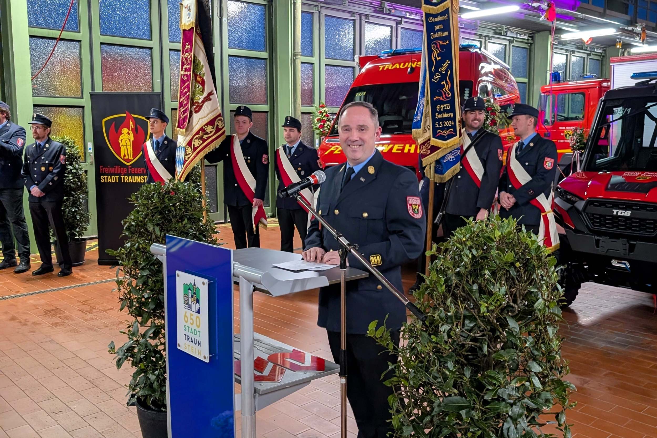 Sauber herausgeputzt und mit Blumenschmuck versehen standen die drei Fahrzeuge in der Fahrzeughalle bereit für ihren „ersten großen Auftritt“. Kommandant Christian Schulz sprach von einem in seiner Laufbahn wohl einmaligen Ereignis: „Dass wir gleich drei neue Fahrzeuge gleichzeitig in Dienst stellen dürfen, ist etwas ganz Besonderes.“ Sein Dank galt insbesondere der aktiven Mannschaft, die die Technik künftig bedienen und zum Schutz der Stadt Traunstein einsetzen wird.