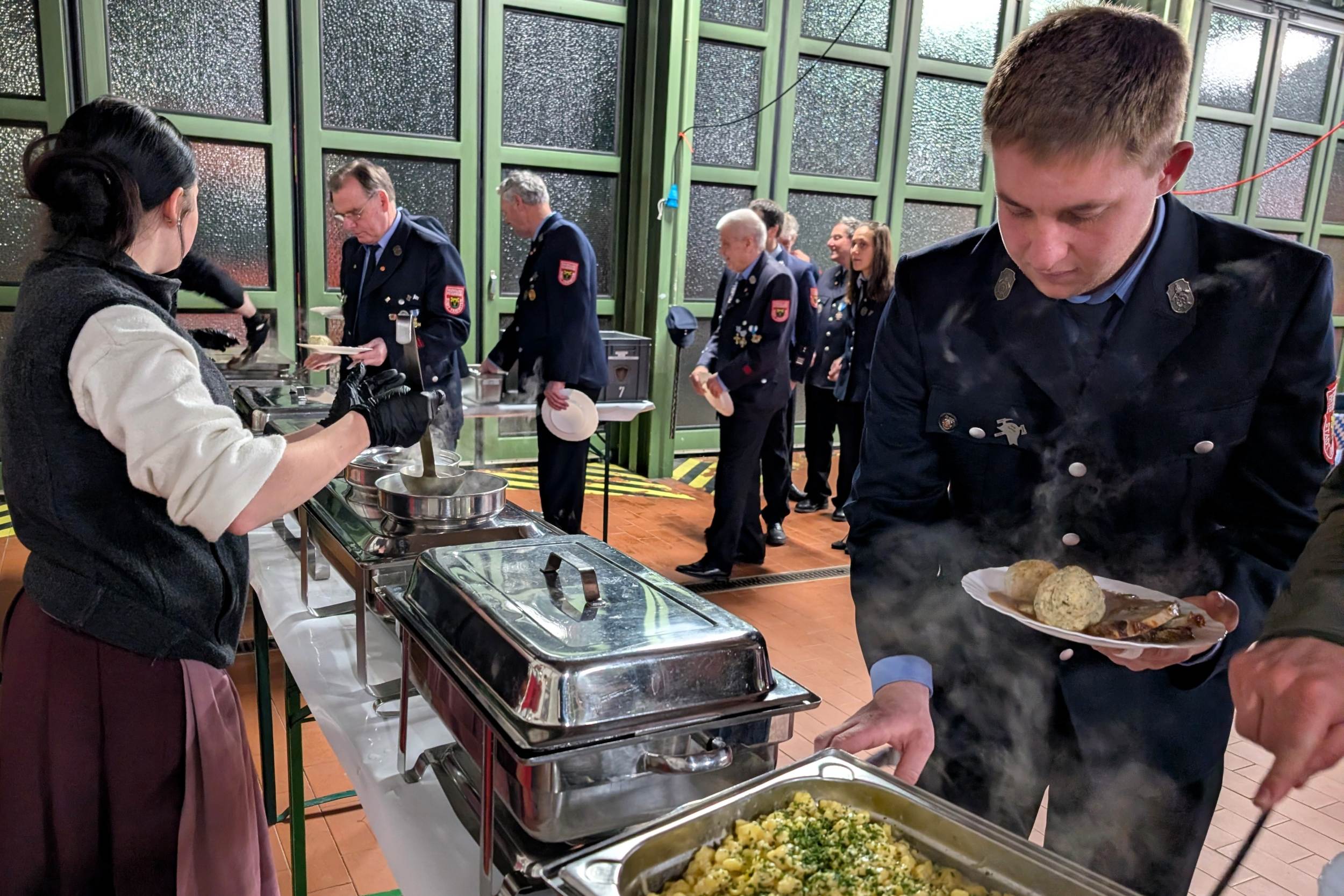 Im Anschluss an den offiziellen Teil kamen die Gäste zu einem gemeinsamen Abendessen zusammen. Neben den Aktiven der Feuerwehr Traunstein nahmen Abordnungen der Feuerwehren Haslach, Hochberg, Kammer und Wolkersdorf sowie der Patenfeuerwehr aus Siegsdorf teil. Viele Gäste nutzten die Gelegenheit, die neuen Fahrzeuge aus nächster Nähe zu besichtigen und einen Blick hinter die Rollläden zu werfen. Hob
