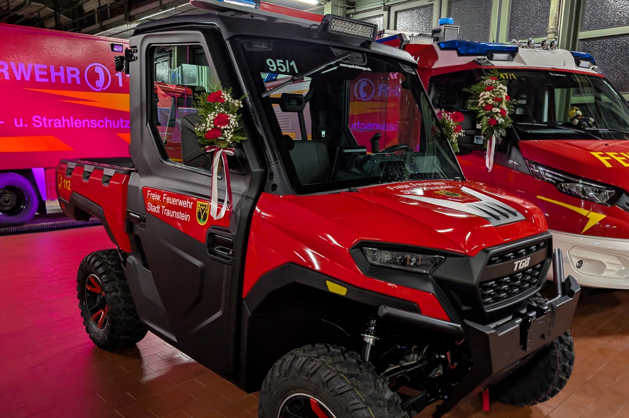 Die offene Ladefläche gewährleistet eine sichere Schwarz-Weiß-Trennung kontaminierter Einsatzmittel und verbessert damit die Einsatzhygiene. Vorgesehen ist der Einsatz bei Veranstaltungen im Stadtgebiet sowie auf Wander- und Radwegen entlang der Traun, wo die geringe Breite und hohe Geländegängigkeit klare Vorteile bieten. Finanziert wurde das ATV vollständig aus Spendenmitteln durch den Feuerwehrverein.