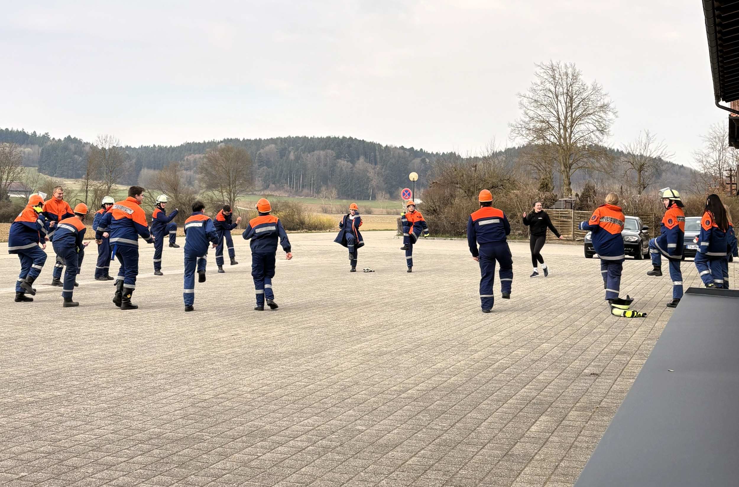 Da die Teilnehmerzahl in diesem Jahr besonders hoch war, wurden die einzelnen Übungseinsätze jeweils zweimal hintereinander durchgeführt. So konnten die Jugendlichen abwechselnd Einsätze fahren oder am Feuerwehrhaus verschiedene Ausbildungsstationen absolvieren. Dabei hatten die jungen Feuerwehrleute unter anderem die Möglichkeit, einen Blick hinter die Kulissen des gemeindlichen Schwimmbades zu werfen.