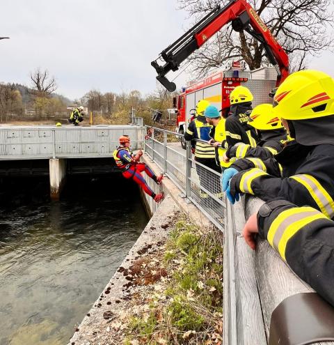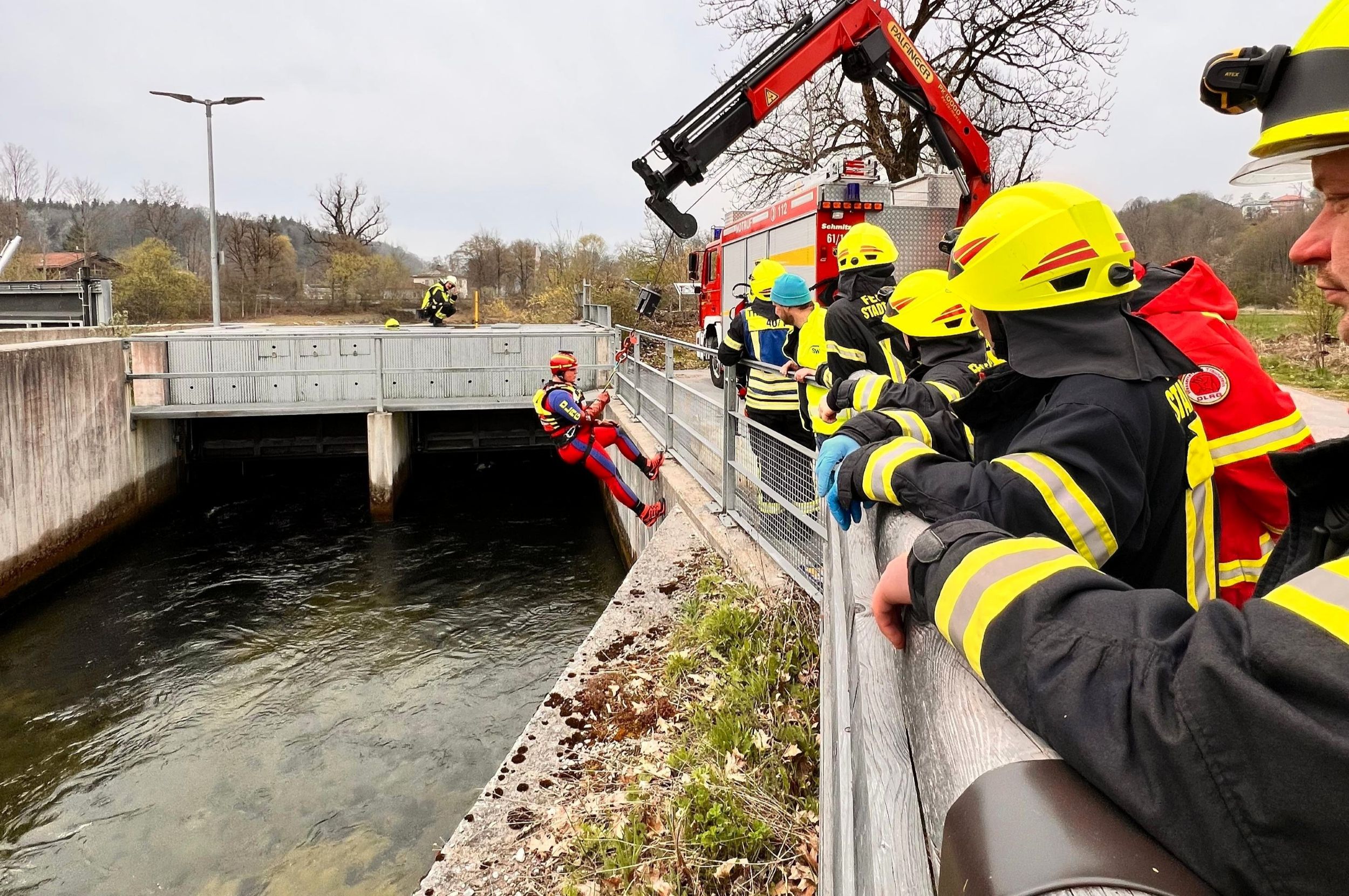 Die Feuerwehr Traunstein wurde am Montag, den 13. April, gegen 12:10 Uhr gemeinsam mit der DLRG Traunstein-Siegsdorf zu einer Tierbergung im Stadtgebiet von Traunstein alarmiert. Passanten hatten am Wehr des Mühlbachs nahe des Schwimmbads einen Tierkörper treiben sehen und daraufhin die Rettungskräfte verständigt. Rund 20 Einsatzkräfte von Feuerwehr und DLRG rückten an. Dank der sehr guten Zusammenarbeit der beteiligten Organisationen konnte der Kadaver eines Bibers innerhalb kurzer Zeit geborgen werden. Hierzu kam ein Strömungsretter zum Einsatz, der am Kran des Rüstwagens der Feuerwehr gesichert war. Für die Dauer der Bergungsmaßnahmen wurde die Schleuse kurzzeitig geschlossen. Das Tier befand sich augenscheinlich bereits seit mehreren Tagen im Wasser. Nach etwa 45 Minuten waren alle Maßnahmen abgeschlossen und die Einsatzkräfte konnten die Einsatzstelle wieder verlassen. Die ebenfalls alarmierte Wasserwacht konnte den Einsatz bereits auf der Anfahrt abbrechen.