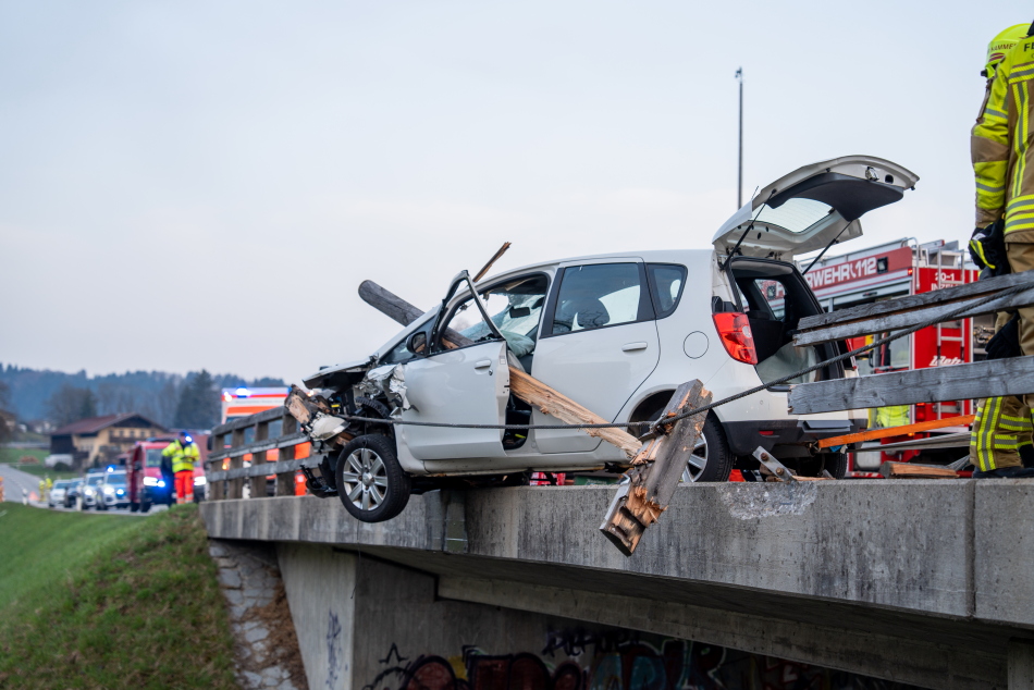 Zu einem spektakulären Verkehrsunfall kam es auf der B 306 in Hammer. Ersten Informationen nach wollte eine ältere Dame mit ihrem Suzuki von Inzell in Richtung Siegsdorf fahren. In Hammer kam die Fahrerin aus bislang ungeklärter Ursache nach links von der Fahrbahn ab und durchbrach das Brückengeländer der roten Traun. Ein Brückenpfeiler durchbohrte hierbei die Windschutzscheibe. Ein Stahlseil, das in die Brücke eingebaut wurde, hielt den PKW noch auf der Brücke. Ohne dieses Stahlseil wäre der PKW mehrere Meter abgestürzt. Wie durch ein Wunder wurde die Dame nur leicht verletzt und mit dem Rettungswagen in ein Klinikum gebracht. Die Feuerwehren aus Hammer und Inzell waren mit 45 Einsatzkräften vor Ort. Sie sicherten den PKW vor dem Abstürzen und unterstützten den Rettungsdienst bei der Erstversorgung. Das BRK war mit einem Rettungswagen, einem Notarzteinsatzfahrzeug und dem Einsatzleiter Rettungsdienst im Einsatz. Der PKW musste durch ein Abschleppunternehmen geborgen werden. Die B 306 war während des Einsatzes komplett gesperrt. Die Polizei Traunstein war mit mehreren Streifen zur Unfallaufnahme vor Ort.