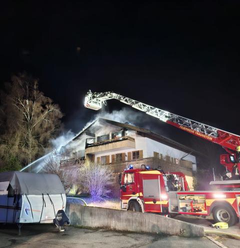 Gegen 22:52 Uhr wurde die Feuerwehr zu dem Wohnhaus in Hufschlag „Am Kircherl“ alarmiert. Bereits auf der Anfahrt war ein deutlicher Feuerschein zu sehen und bei Eintreffen der ersten Einsatzkräfte bestätigten diese einen Vollbrand im Dachstuhl. Parallel gingen weitere Notrufe bei der Integrierten Leitstelle in Traunstein ein, die von einem Gebäudebrand berichteten.