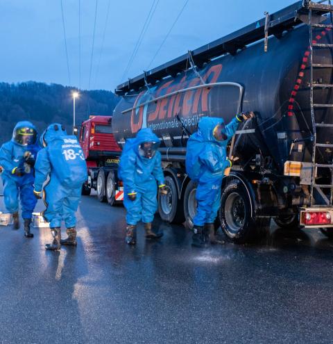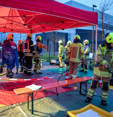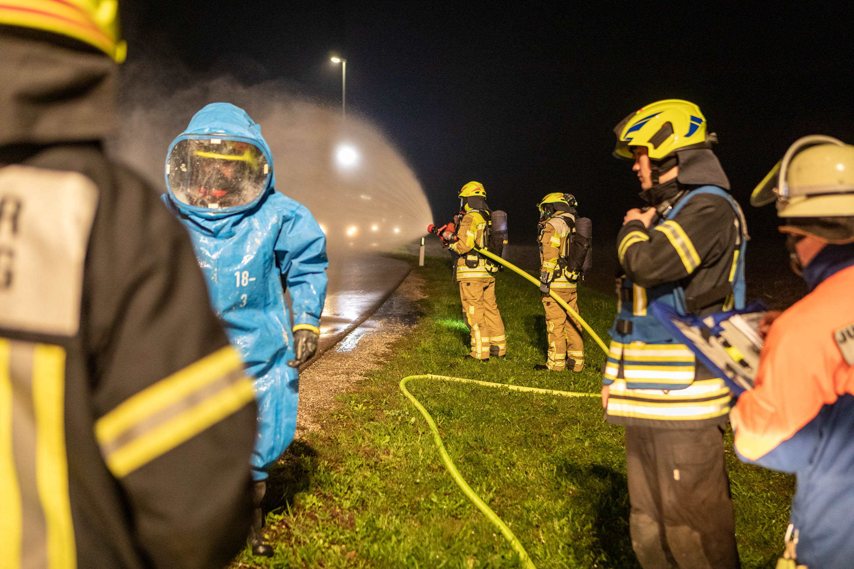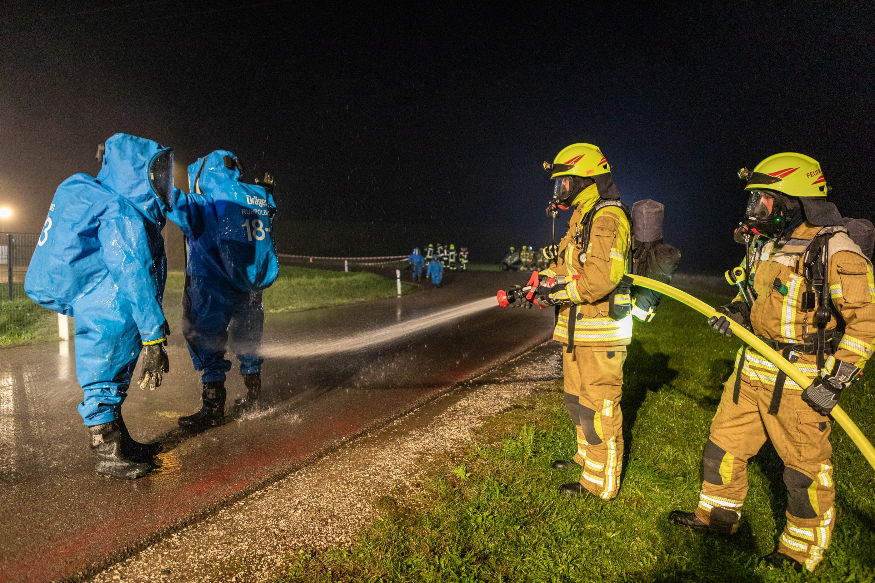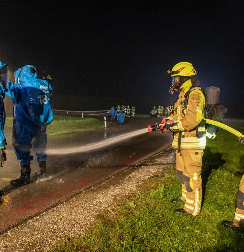 Neben den Erstmaßnahmen zum Auffangen der austretenden Flüssigkeit wurden umfangreiche Maßnahmen zur Eindämmung des Gefahrstoffaustritts erforderlich. Besonderes Augenmerk lag auf der Arbeit unter schweren Chemikalienschutzanzügen, dem Abdichten des austretenden Stoffes sowie dem Aufbau und Betrieb einer Dekontaminationsstelle. „Gefahrguteinsätze sind für die Feuerwehren häufig sehr komplexe Einsatzlagen, die neben umfangreichem taktischem Wissen auch eine material- und personalintensive Herangehensweise erfordern“, erklärt Rupert Kink.