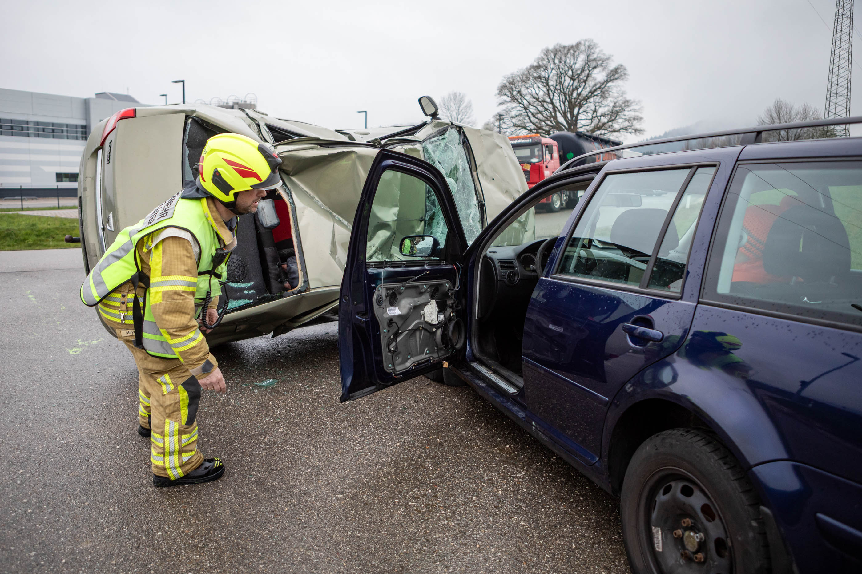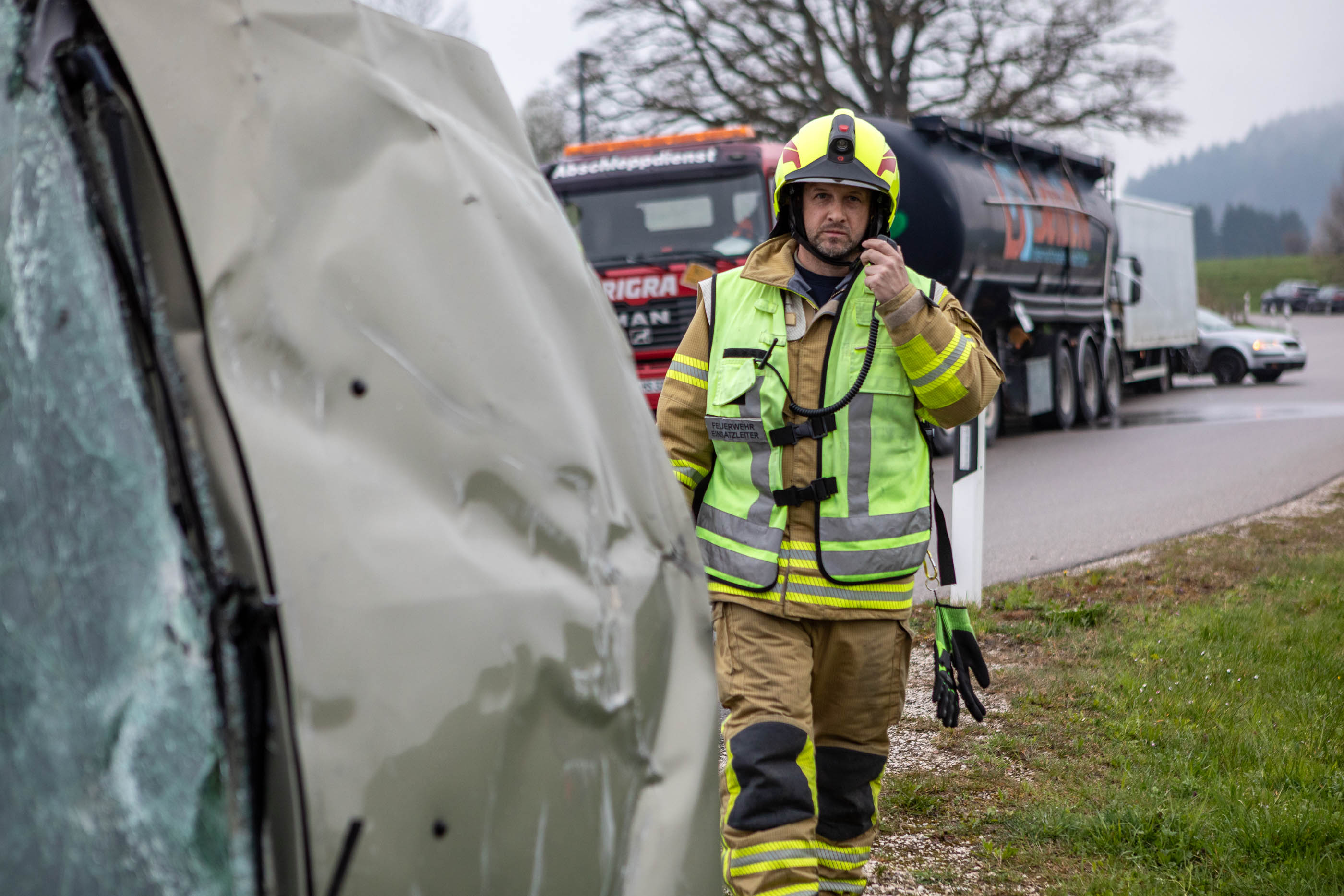 Ausgangslage war ein schwerer Verkehrsunfall, bei dem ein LKW mit dem Gefahrstoff Phosphorsäure auf einen PKW auffuhr. Dieser wurde in den Gegenverkehr geschleudert und kollidierte frontal mit einem weiteren Fahrzeug. In der Folge fuhr ein weiterer LKW auf den ersten LKW auf, zusätzlich prallte ein weiterer PKW auf das Unfallgeschehen. Sämtliche Fahrzeuge waren „Schrottfahrzeuge“, die von der Firma Rigra zur Verfügung gestellt worden waren. Die Einsatzleitung übernahm Hansjörg Mayer, stellvertretender Kommandant aus Siegsdorf.