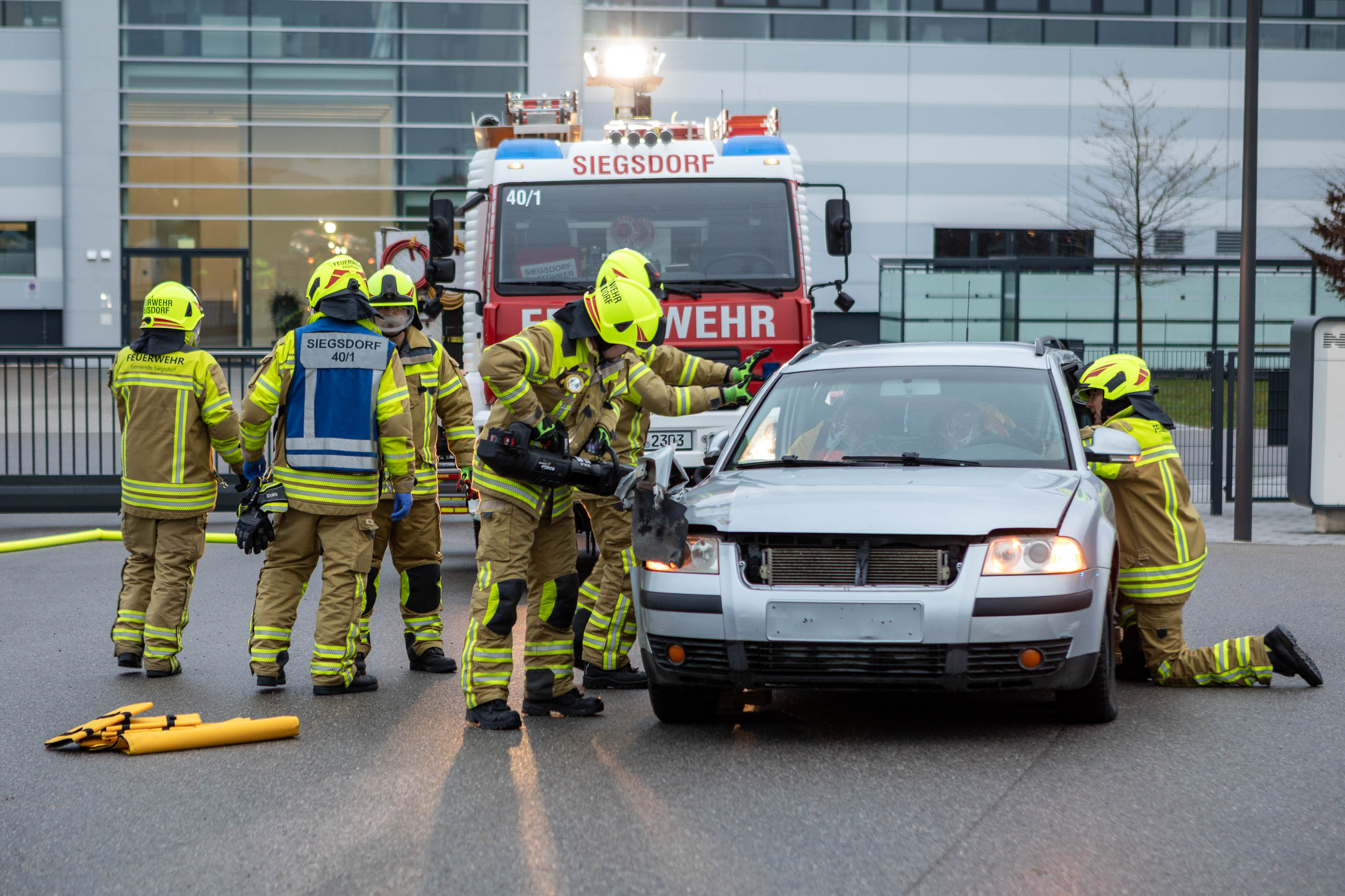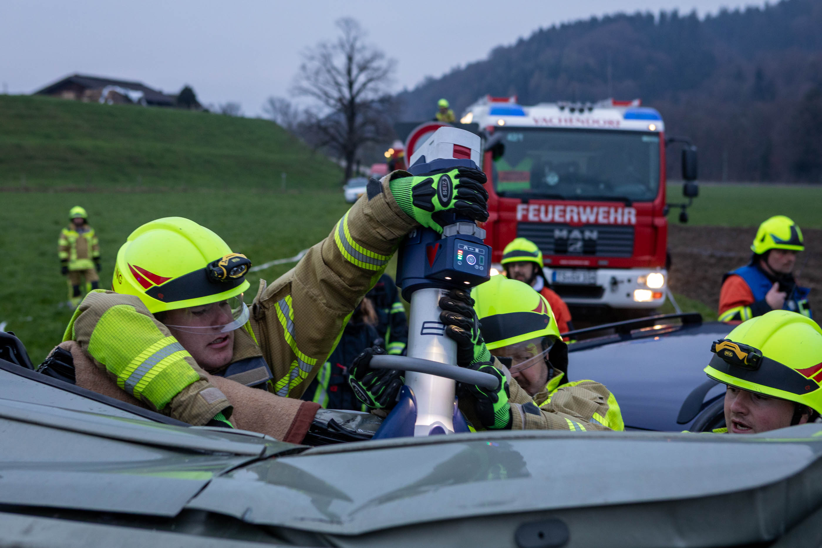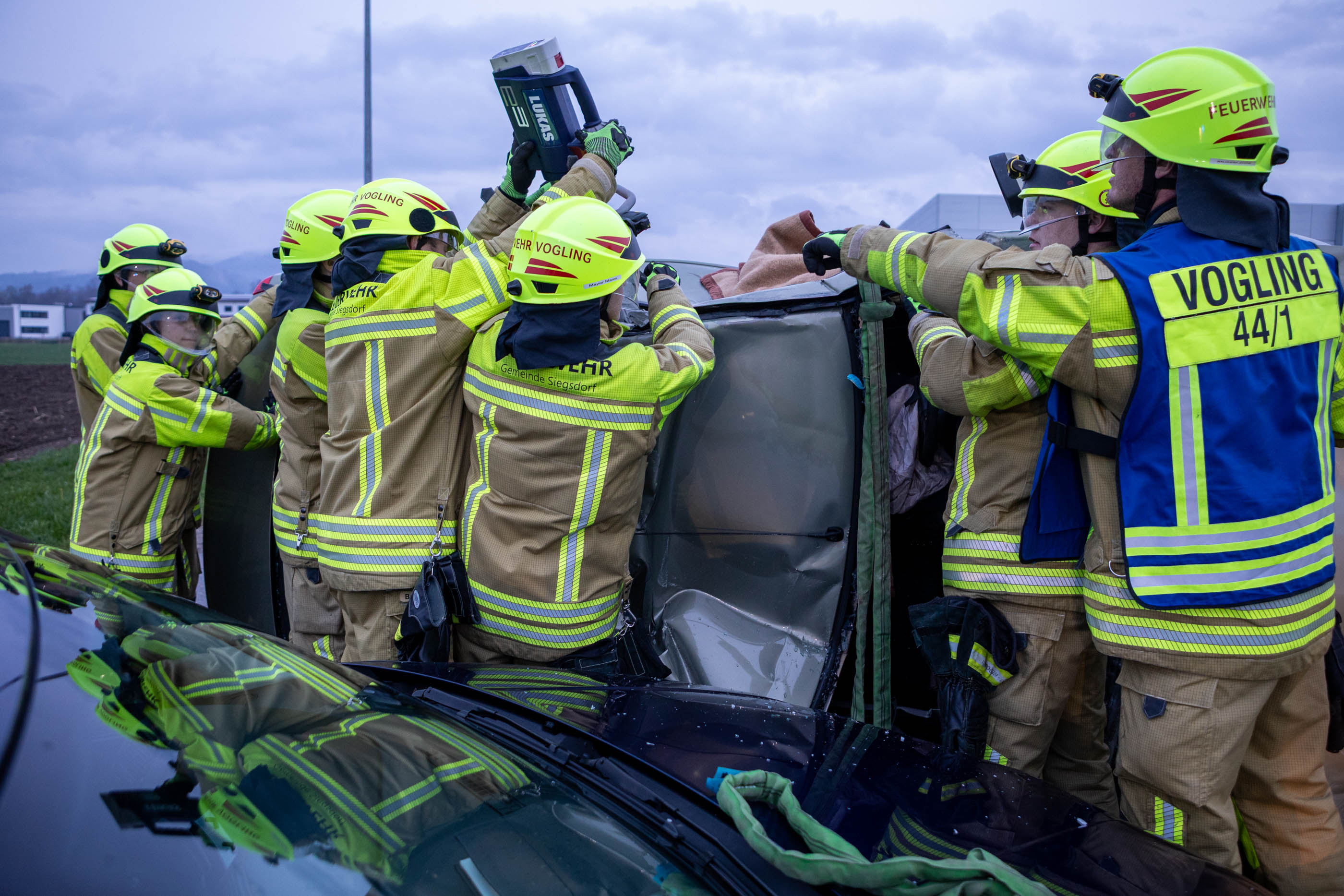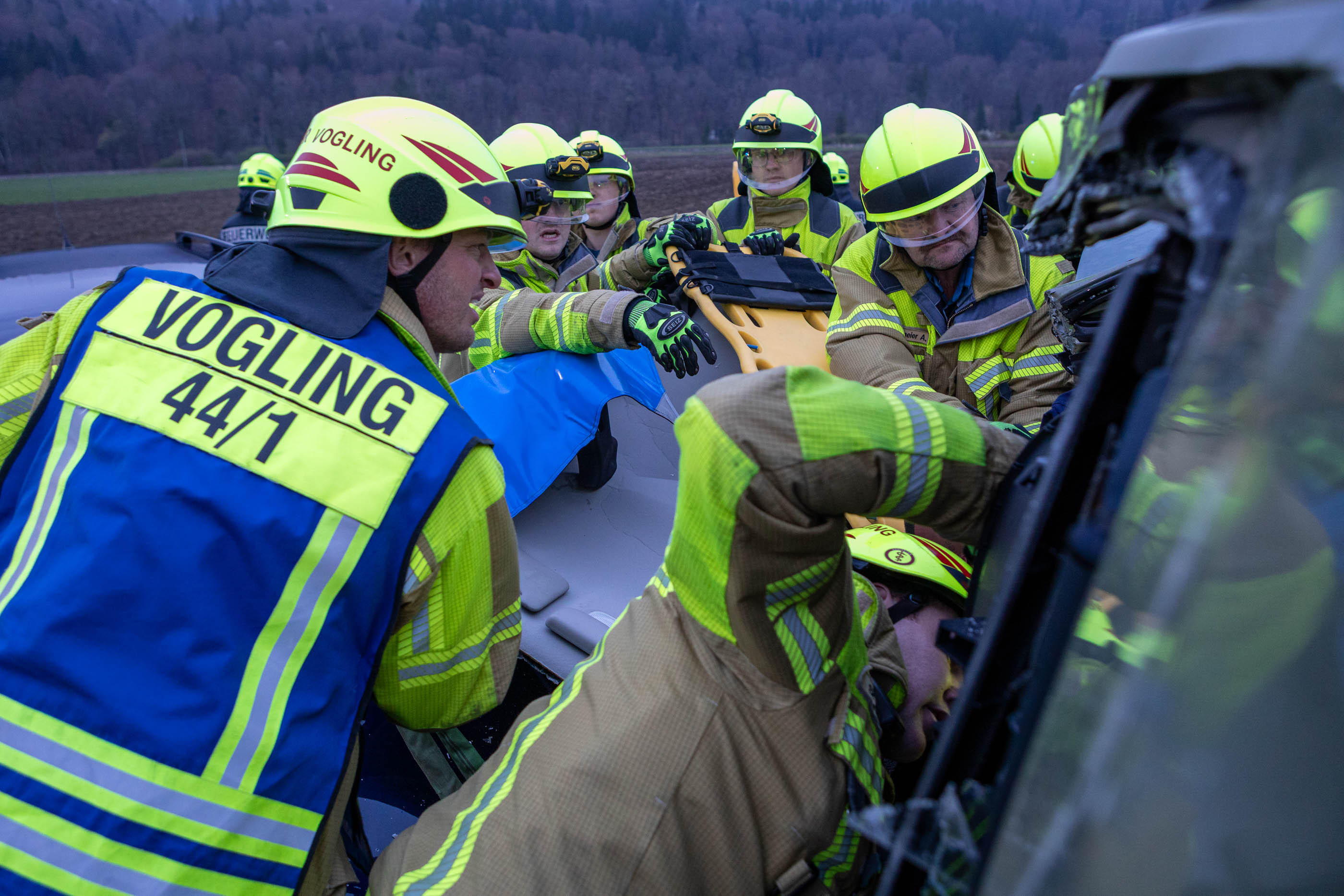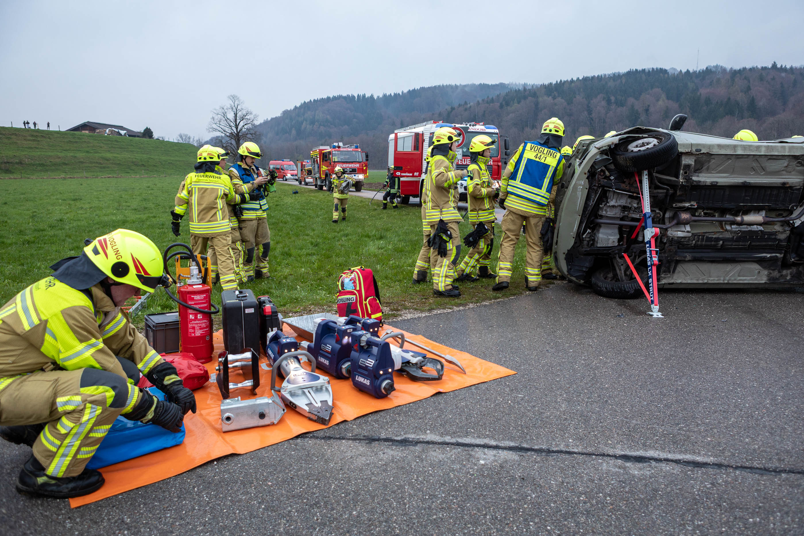 Im Mittelpunkt der Übung stand die parallele Abarbeitung mehrerer Einsatzabschnitte unter schwierigen Bedingungen. Die Rettung der eingeklemmten Personen erfolgte zeitgleich in verschiedenen Bereichen: Bei einem Frontalzusammenstoß zweier PKW wurden beispielsweise die Feuerwehren Vogling und Vachendorf tätig. Sie konnten zwei Menschen aus den Fahrzeugen retten.