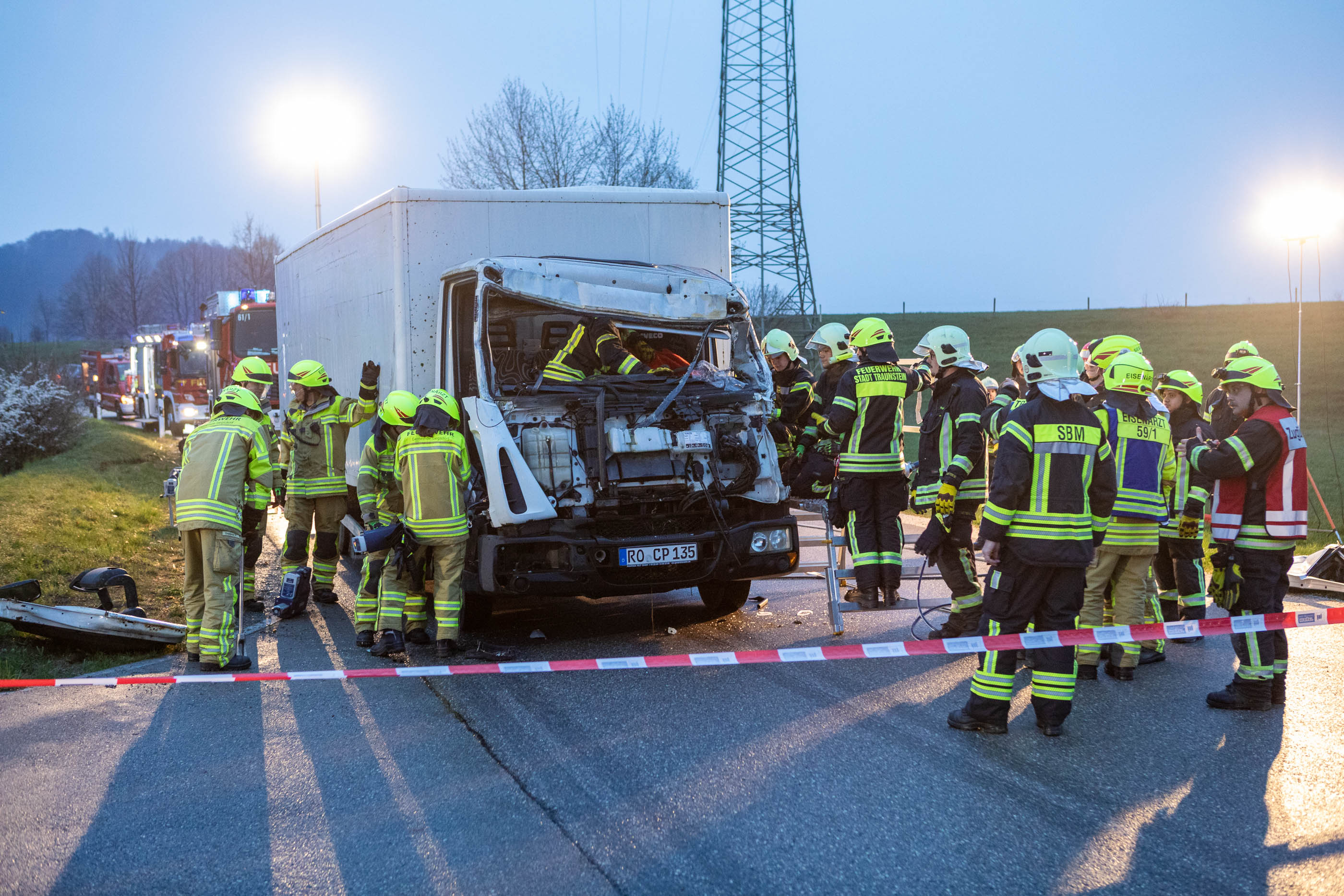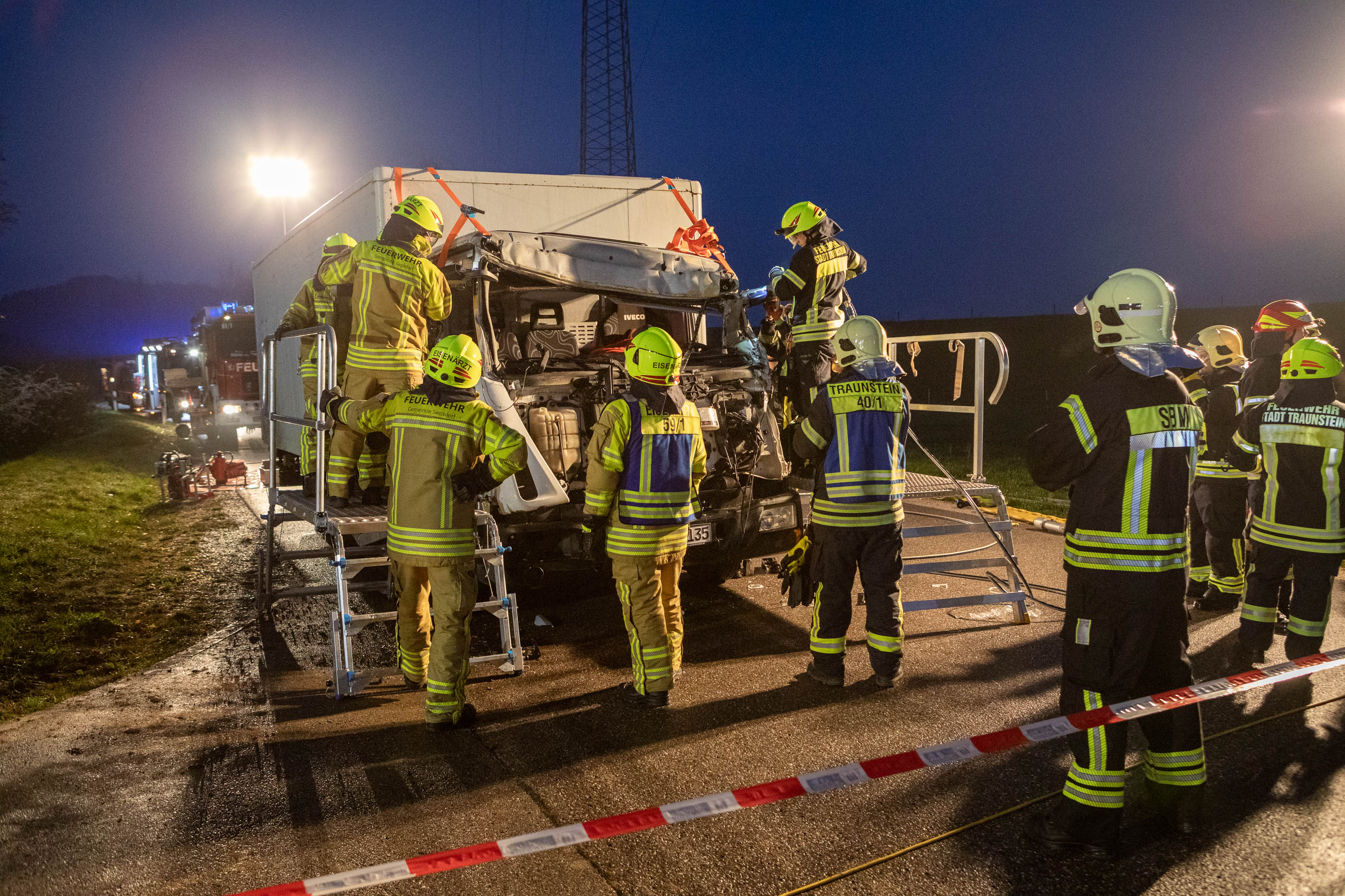 Bei dem Auffahrunfall zwischen einem PKW und einem LKW waren Einsatzkräfte aus Siegsdorf und Traunstein gefordert. Durch den Einsatz schweren technischen Geräts konnten so vier weitere eingeklemmte Personen aus den Fahrzeugen gerettet werden. In diesem Einsatzabschnitt stellte die hohe Sitzposition des LKW-Fahrers eine besondere Herausforderung dar. Daher kam dort unter anderem eine sogenannte Rettungsplattform zum Einsatz, um den Höhenunterschied zwischen Straße und Fahrerkabine zu überwinden.