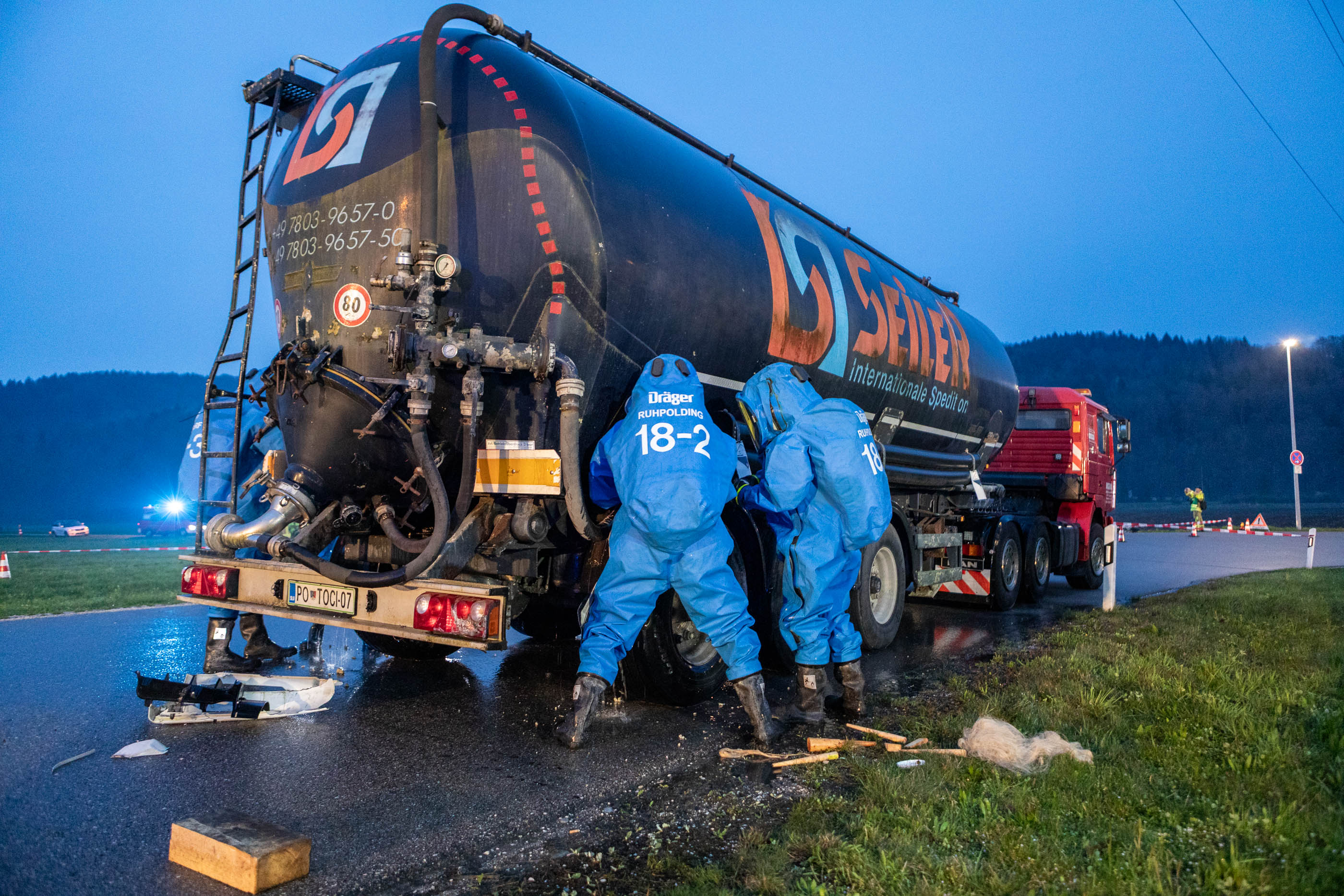 Parallel dazu wurde der LKW-Fahrer im Gefahrgutbereich unter Beteiligung der Feuerwehren aus Ruhpolding, Siegsdorf, Eisenärzt und Hammer erstversorgt. Eine der größten Herausforderungen in diesem Abschnitt war ein etwa zehn Zentimeter großer Riss im Tank des Gefahrgutaufliegers. Dort lief kontinuierlich Flüssigkeit aus, die als ätzende Phosphorsäure gekennzeichnet war. Tatsächlich befand sich im Tank jedoch Wasser, sodass im Rahmen der Übung keine Gefahr für Einsatzkräfte oder Umwelt bestand.