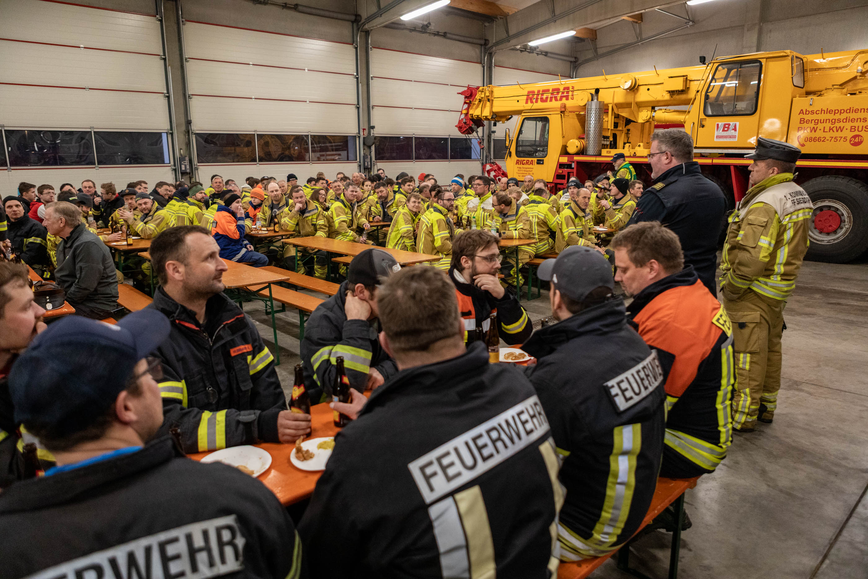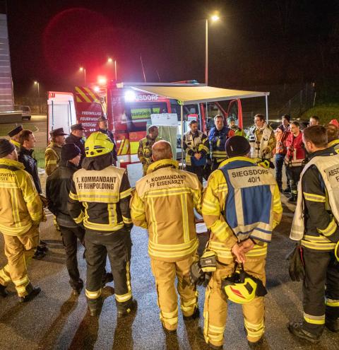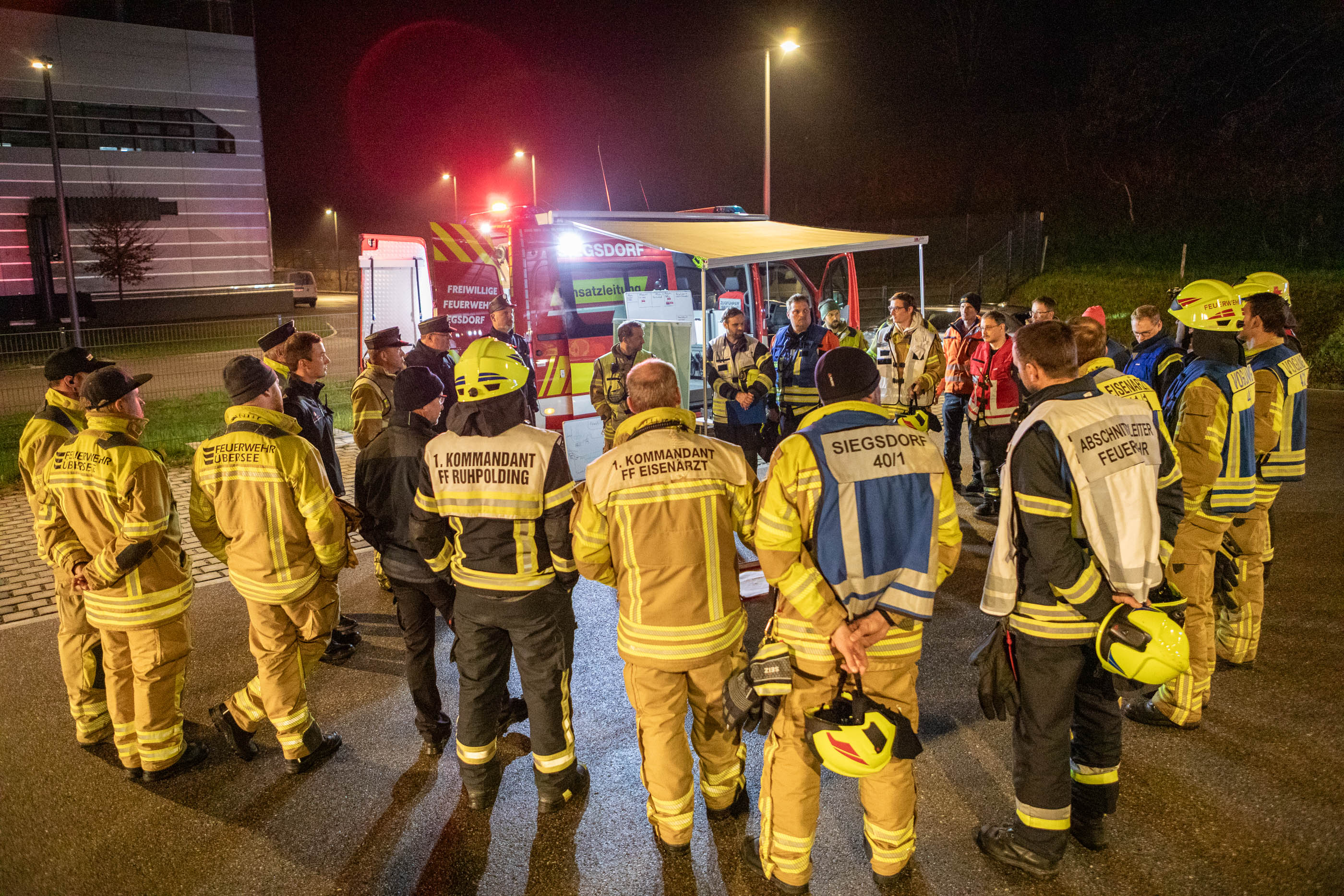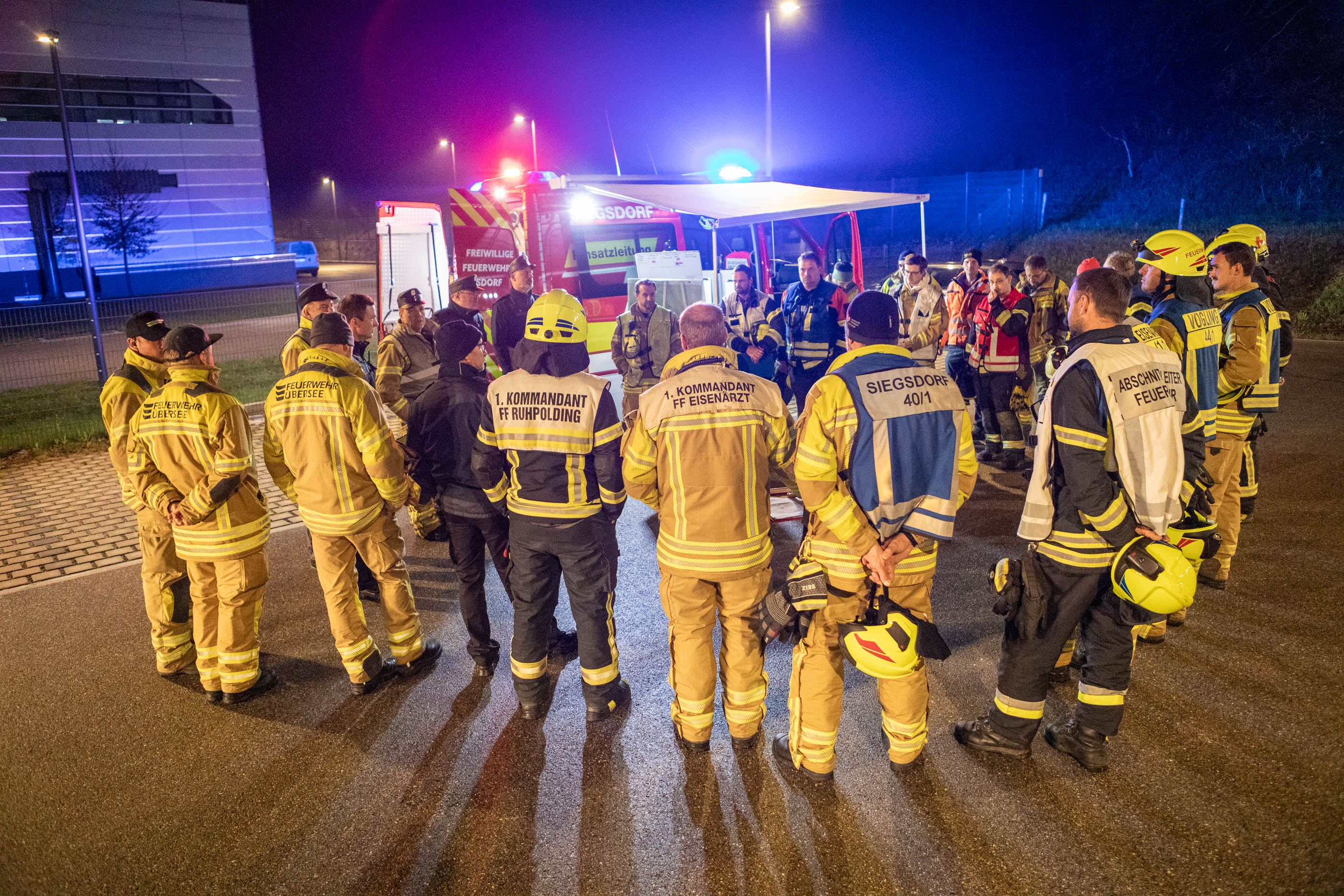 Im Nachgang der Übung kamen die Teilnehmer in den Hallen der Firma Rigra zu einer kurzen Nachbesprechung zusammen. Auf Einladung der Gemeinde Siegsdorf konnten sie den Abend mit einer gemeinsamen Brotzeit ausklingen lassen, ehe sie ihre Heimreise antraten. Insgesamt waren 180 Feuerwehrleute aus den Feuerwehren Siegsdorf, Eisenärzt, Hammer, Vogling, Ruhpolding, Vachendorf, Übersee und Traunstein in die Übung eingebunden. Hob