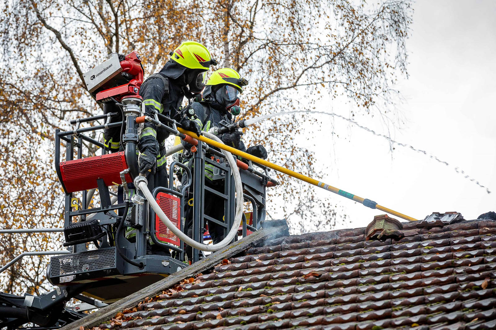 Zahlreiche Atemschutzgeräteträger wurden zur Brandbekämpfung, teils über die beiden alarmierten Drehleiterfahrzeuge, zum Einsatz gebracht. Um das Feuer und die Glutnester löschen zu können, musste an manchen Stellen das Dach geöffnet werden. Die Löschmaßnahmen dauerten bis in die späten Nachmittagsstunden. Der ebenfalls alarmierte Rettungsdienst musste nicht eingreifen. Verletzt wurde niemand. Die Polizei hat bereits die Ermittlungen aufgenommen. Einer ersten Schätzung nach ist ein Schaden in Höhe von rund 500.000 Euro entstanden. Hob
