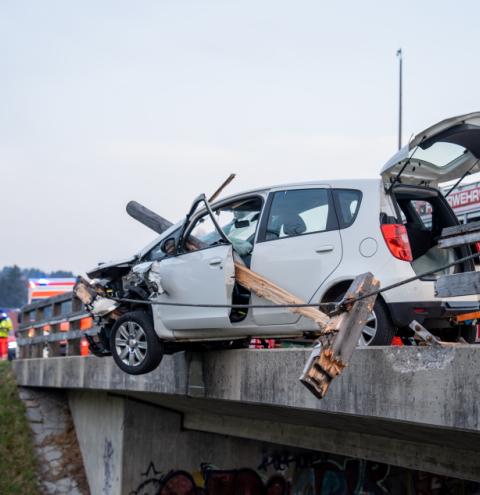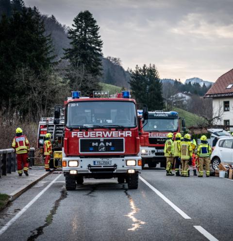 Zu einem spektakulären Verkehrsunfall kam es auf der B 306 in Hammer. Ersten Informationen nach wollte eine ältere Dame mit ihrem Suzuki von Inzell in Richtung Siegsdorf fahren. In Hammer kam die Fahrerin aus bislang ungeklärter Ursache nach links von der Fahrbahn ab und durchbrach das Brückengeländer der roten Traun. Ein Brückenpfeiler durchbohrte hierbei die Windschutzscheibe. Ein Stahlseil, das in die Brücke eingebaut wurde, hielt den PKW noch auf der Brücke. Ohne dieses Stahlseil wäre der PKW mehrere Meter abgestürzt. Wie durch ein Wunder wurde die Dame nur leicht verletzt und mit dem Rettungswagen in ein Klinikum gebracht. Die Feuerwehren aus Hammer und Inzell waren mit 45 Einsatzkräften vor Ort. Sie sicherten den PKW vor dem Abstürzen und unterstützten den Rettungsdienst bei der Erstversorgung. Das BRK war mit einem Rettungswagen, einem Notarzteinsatzfahrzeug und dem Einsatzleiter Rettungsdienst im Einsatz. Der PKW musste durch ein Abschleppunternehmen geborgen werden. Die B 306 war während des Einsatzes komplett gesperrt. Die Polizei Traunstein war mit mehreren Streifen zur Unfallaufnahme vor Ort.