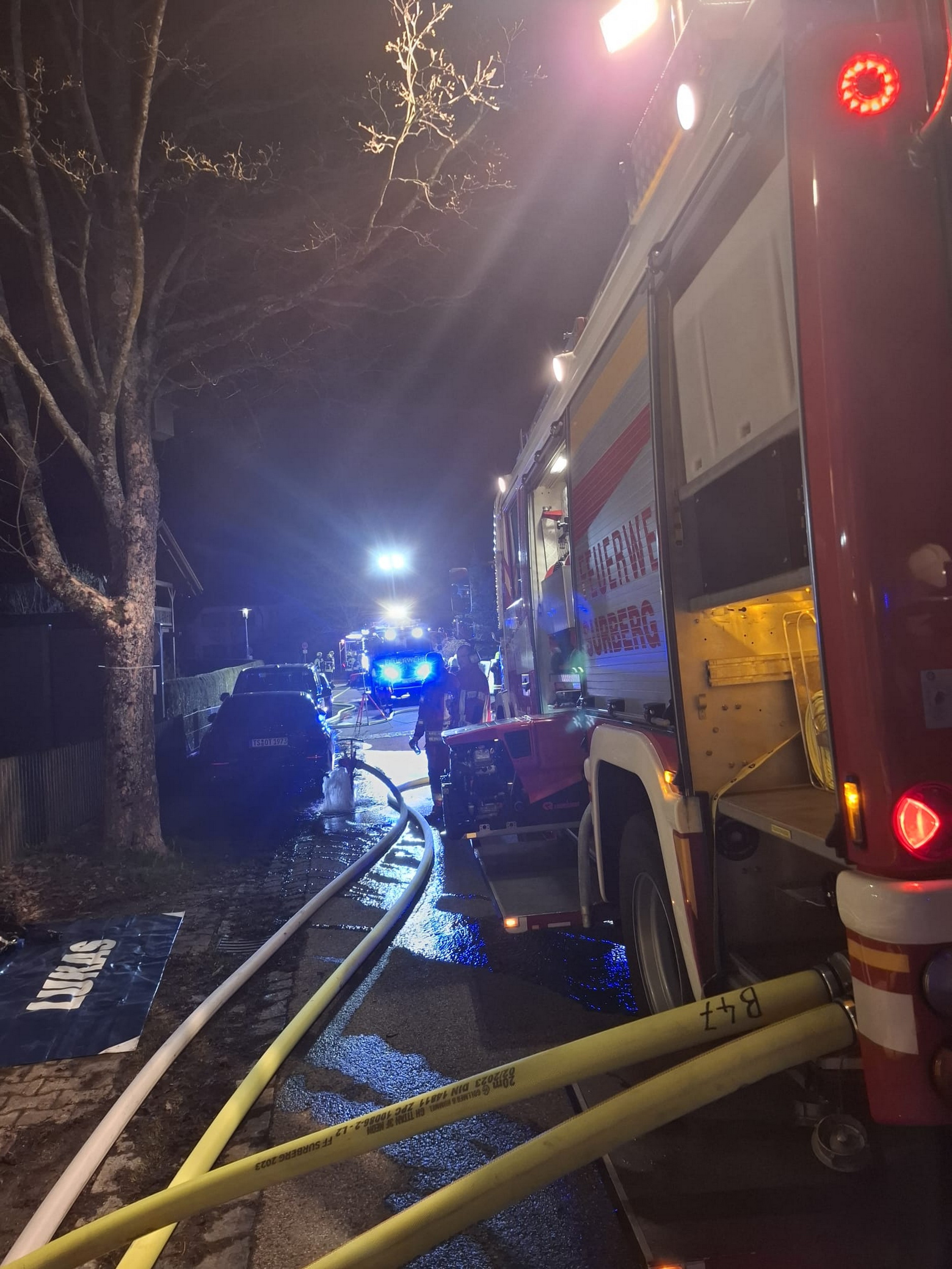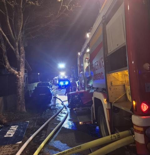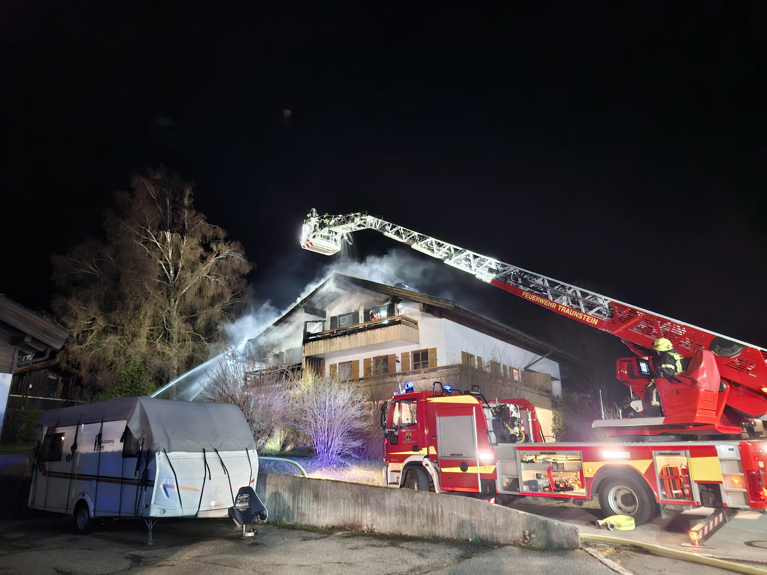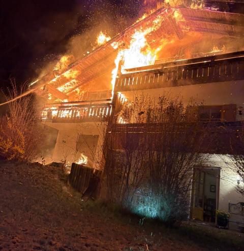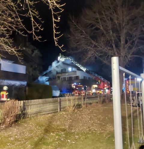 Gegen 22:52 Uhr wurde die Feuerwehr zu dem Wohnhaus in Hufschlag „Am Kircherl“ alarmiert. Bereits auf der Anfahrt war ein deutlicher Feuerschein zu sehen und bei Eintreffen der ersten Einsatzkräfte bestätigten diese einen Vollbrand im Dachstuhl. Parallel gingen weitere Notrufe bei der Integrierten Leitstelle in Traunstein ein, die von einem Gebäudebrand berichteten.